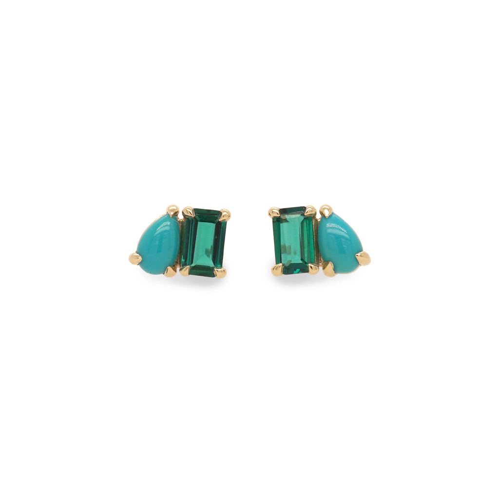 Emerald and Turquoise Stud Earrings in 14K Yellow Gold
