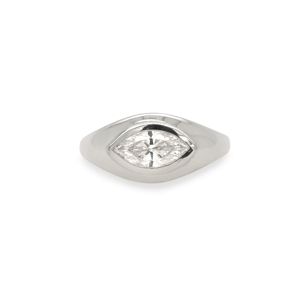 Bold and sculptural, The Lauryn features a tapered band that rises into a smooth, domed top for a striking, modern silhouette. At its center, an east-west set diamond offers a fresh, unexpected take on tradition—enhancing the stone’s brilliance while creating a distinctive, elongated look.